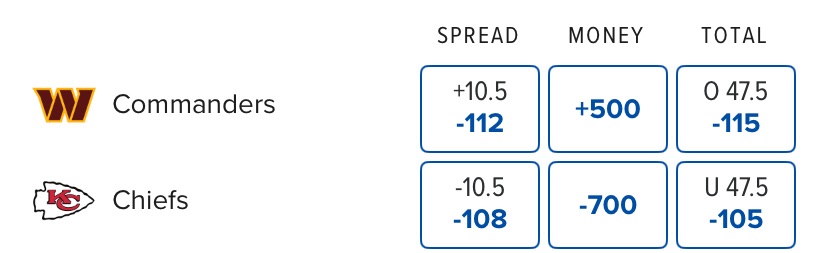Our Best Bets went 0-4 yesterday. It was supposed to be a celebration of National Tight Ends Day and it did not live up to the hype of last year’s success. Not even Jamie was able to pick a winning bet. It was a rough day for betting and quite honestly, it was not a great day of ball. The only one score game was the Jets-Bengals game at 1 PM. Let’s hope that the game between the Commanders and Chiefs tonight proves to be more entertaining and profitable than yesterday. I have gone through the available bets and picked the one that I believe will hit. Let’s make some money!